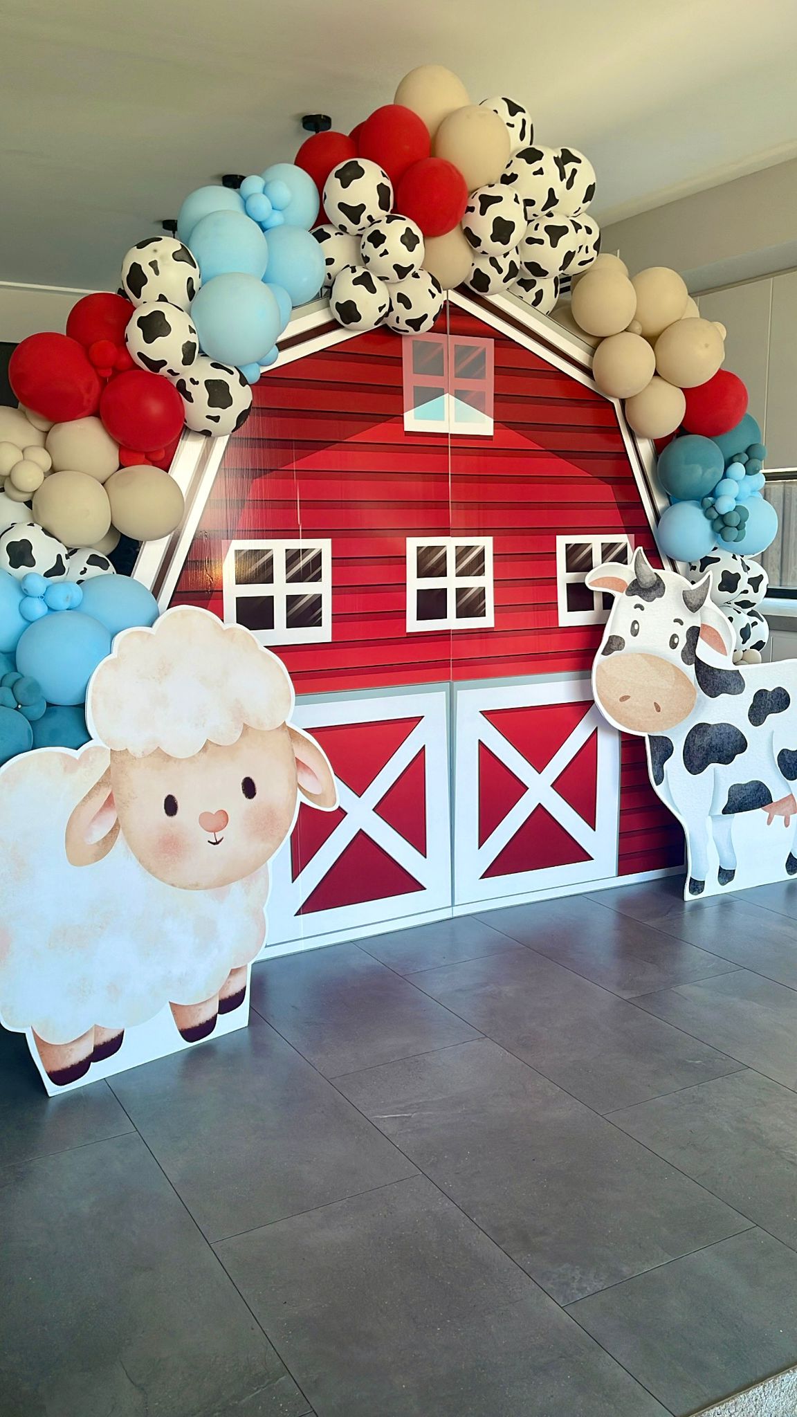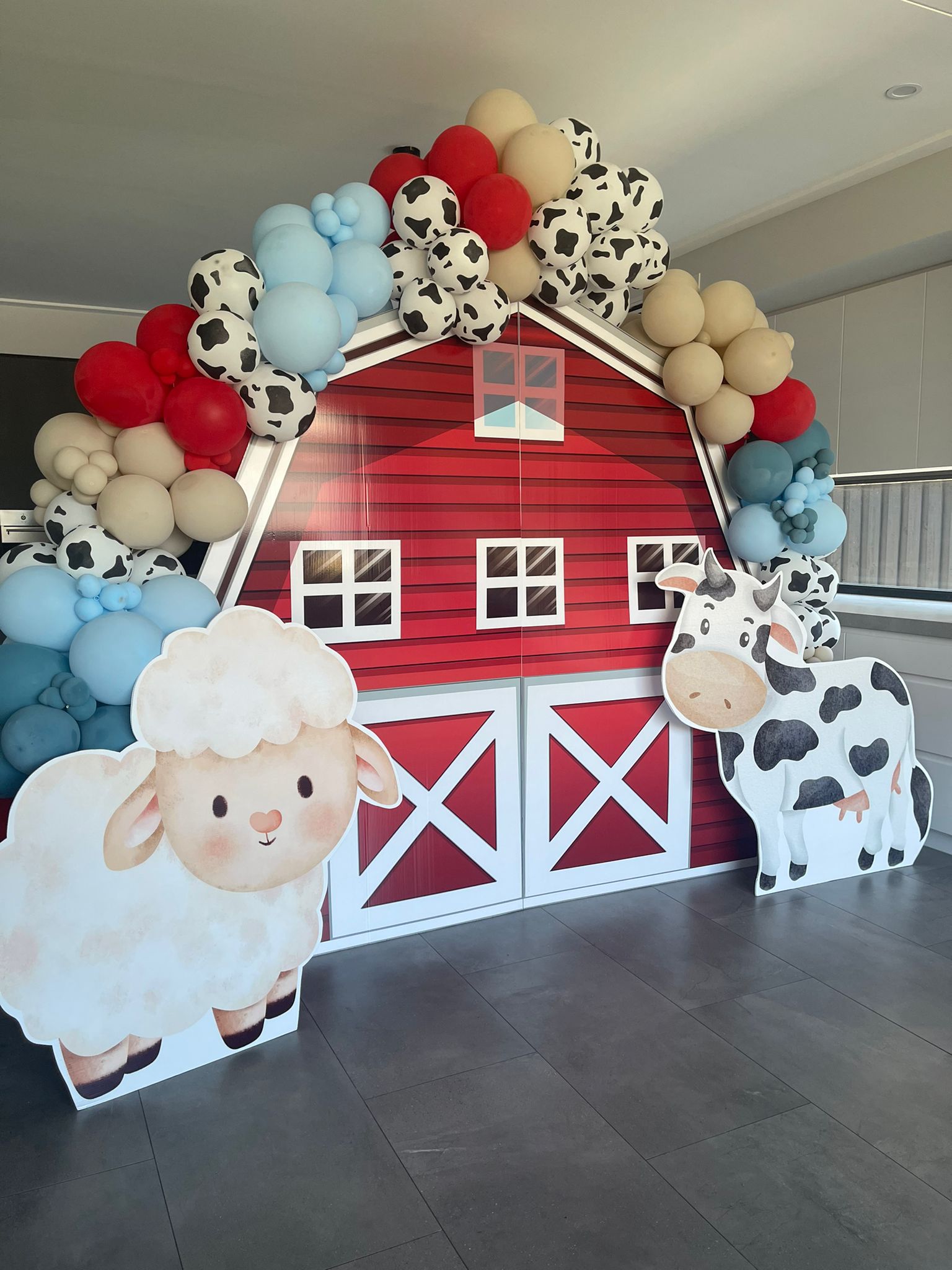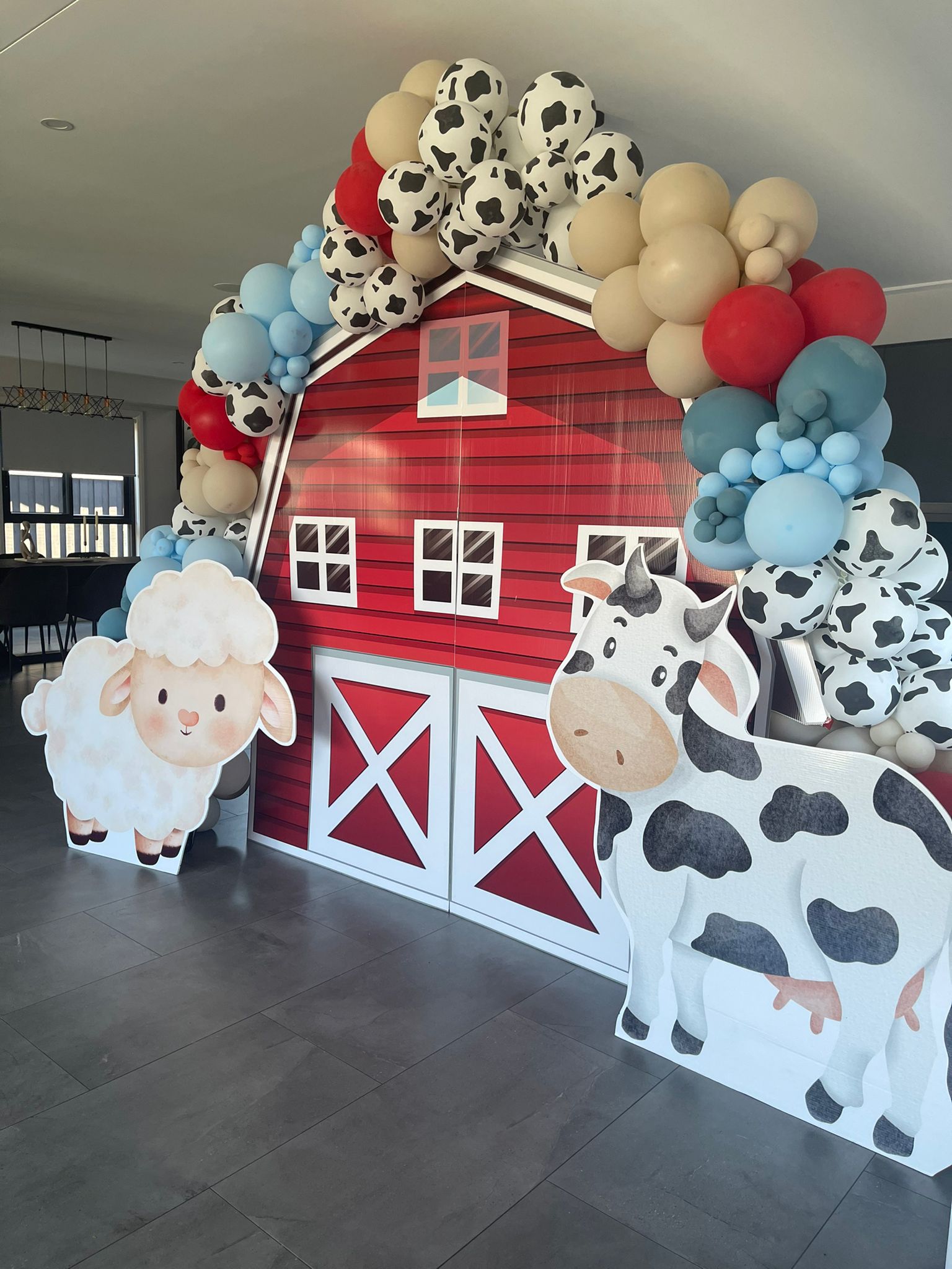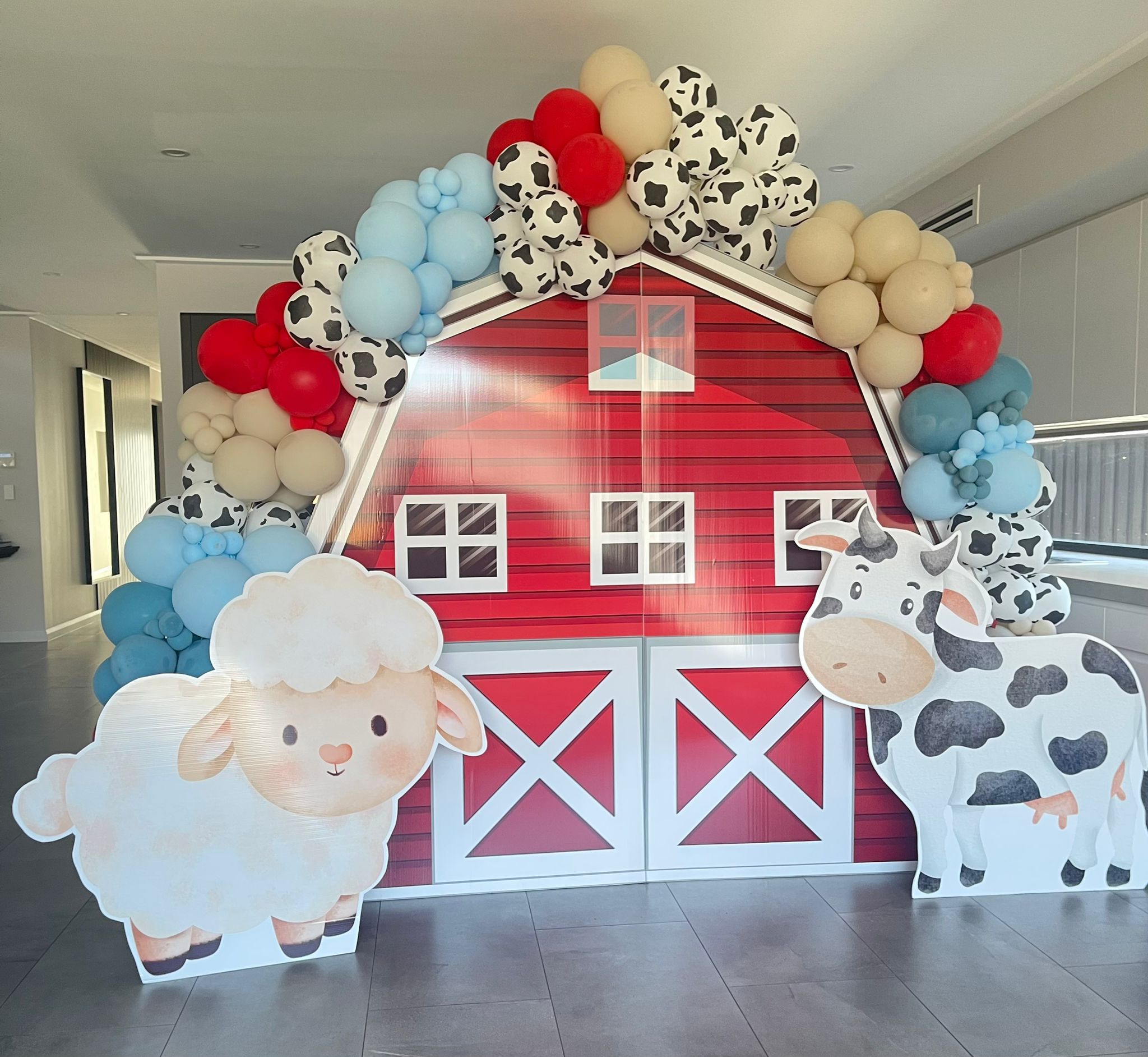 Hire our adorable Farmhouse Backdrop & 2 Animal Lifesize Standees !