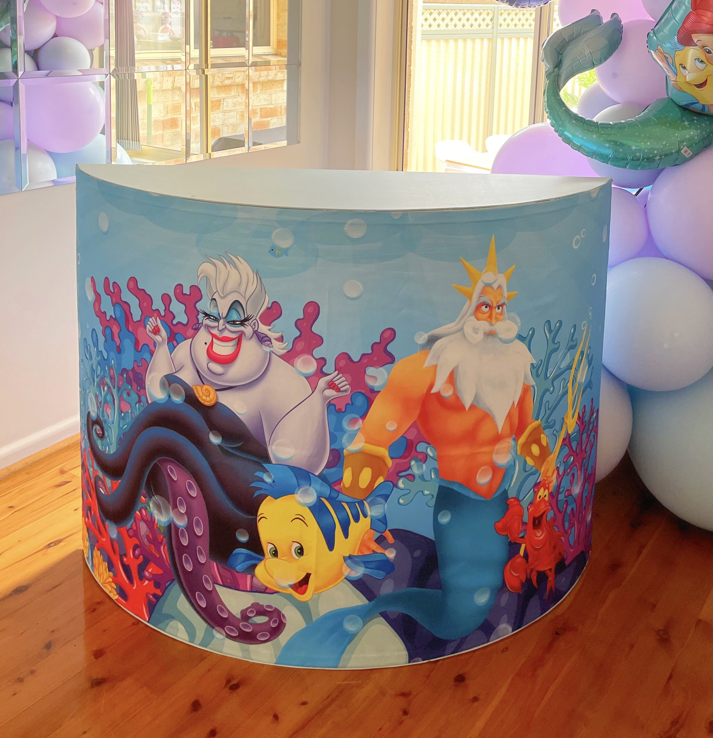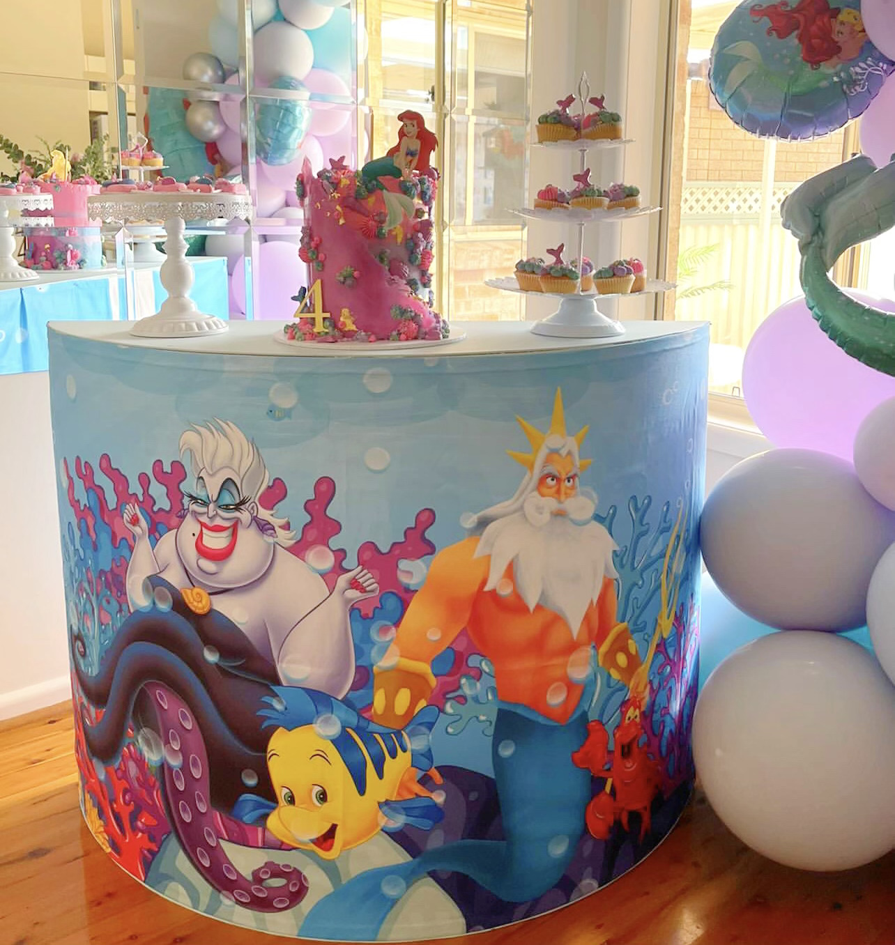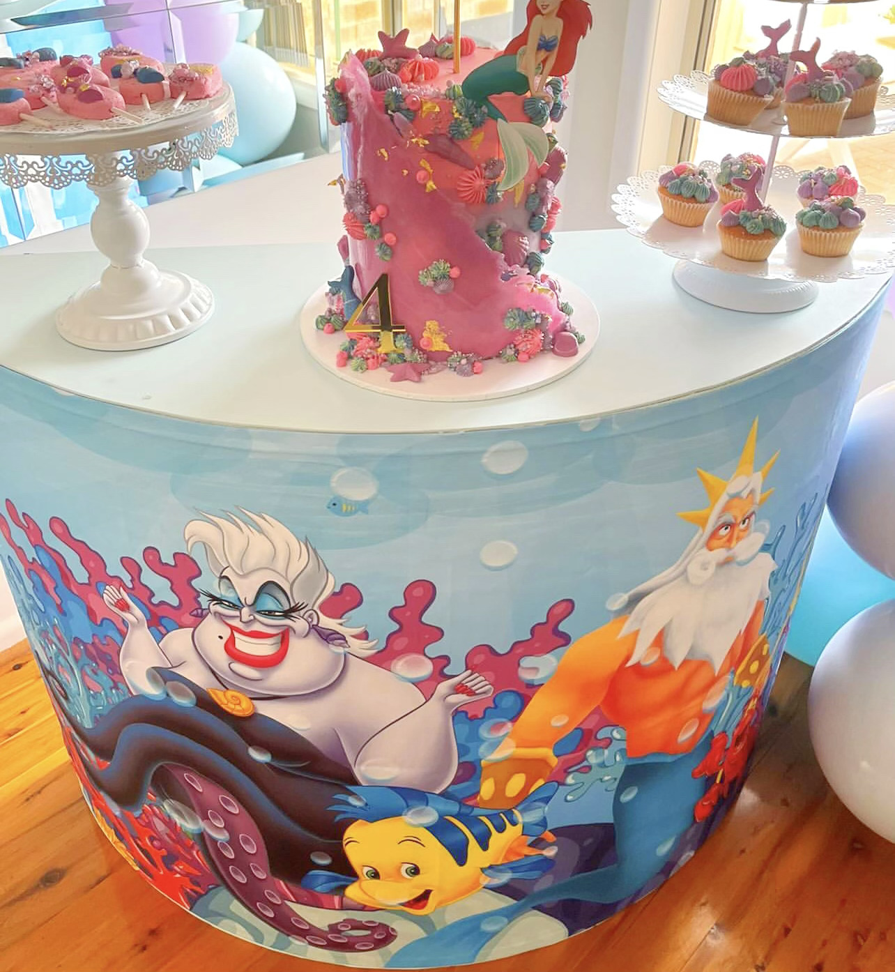 Our Mermaid Cake Table is Super cute to add to your Underwater Party and provides a great space for cake and desserts.